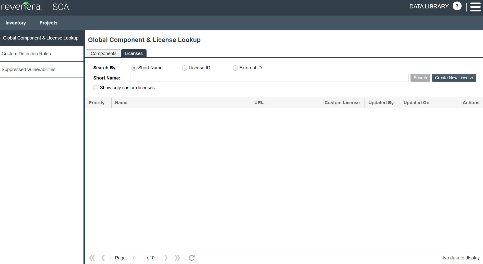 The Global Component & License Lookup > Licenses tab enables users to search for various OSS or third-party licenses that are standard to the Code Insight Data Library or that are custom.
