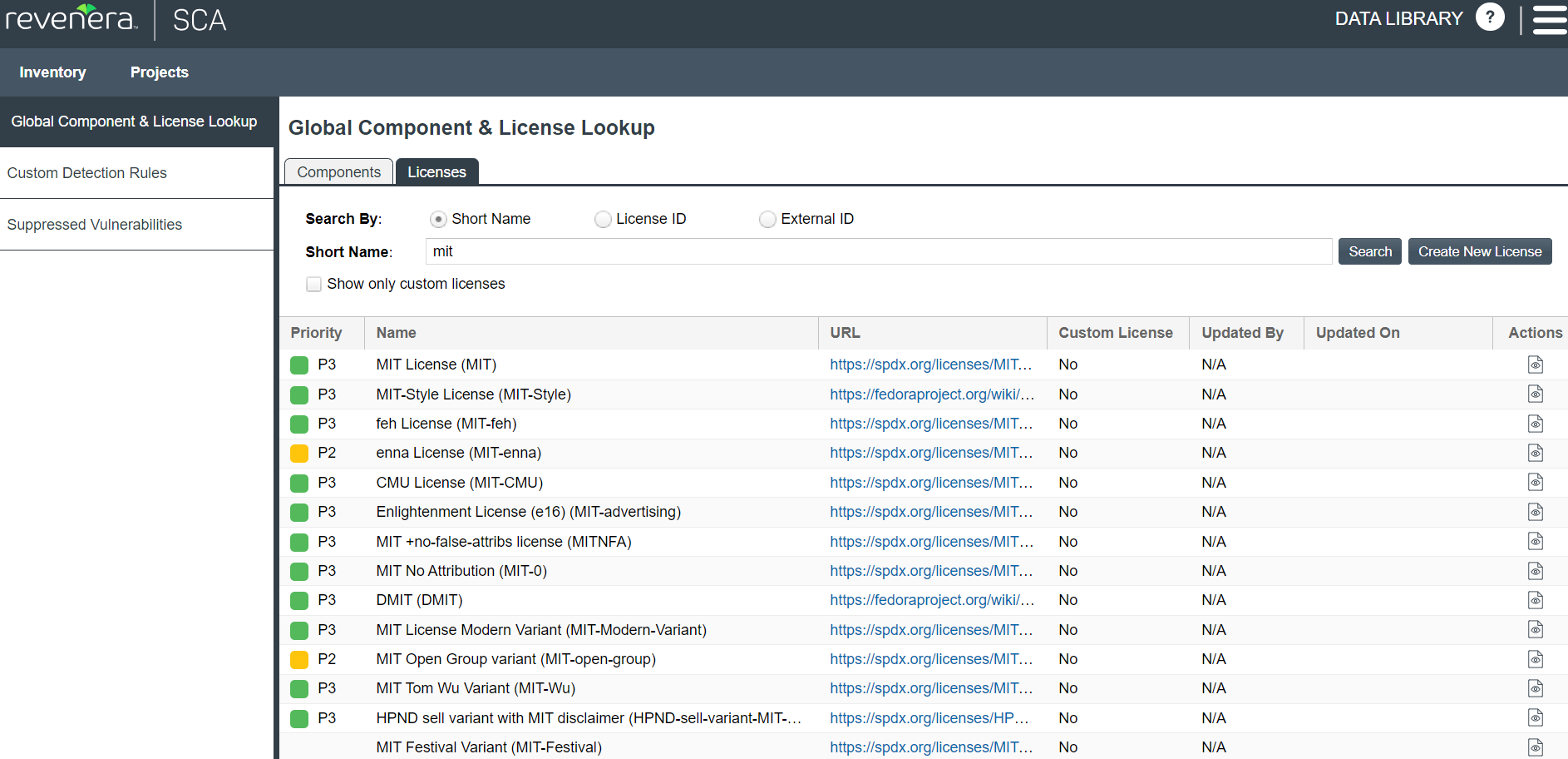 Once you have performed a successful search of licenses (the setup of which is described in Setting Up a Global License Search), the results are listed in a grid below your search criterion on the Global Component & License Lookup > Licenses tab. (For a complete description of the details shown for the licenses in these results, see Licenses Tab.)