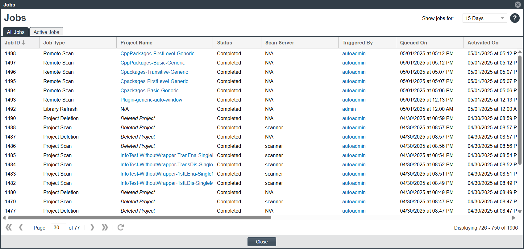 The Jobs queue, which lists all jobs, is displayed on the All Jobs tab in the Jobs window, regardless of the server. This queue provides a comprehensive list of all jobs (Scan Server and Core Server jobs) across your Code Insight system. For a detailed description of the columns that provide details for each job in the Jobs queue, see Jobs Queue.