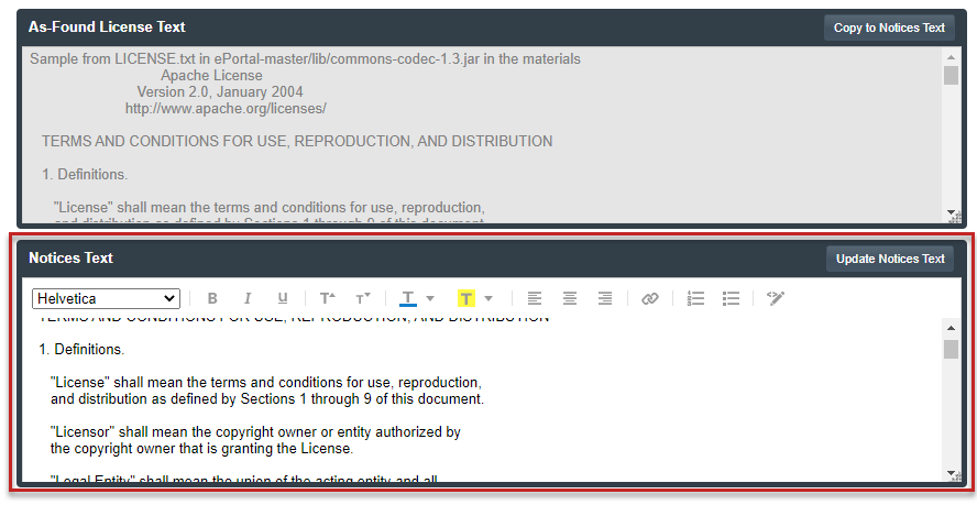 The Notices Text field is used to finalize the license text for use in the Notices report. (This field is located under the As-Found License Text field on the Notices Text tab for a selected inventory item in the Analysis Workbench and in Project Inventory .) For example, you can copy the contents of the As-Found License Text field to this field and modify the text as needed. Alternatively, you can pull in the current license text from the Code Insight Data Library (and modify it as needed); or you can simply provide your own Notices content in this field.